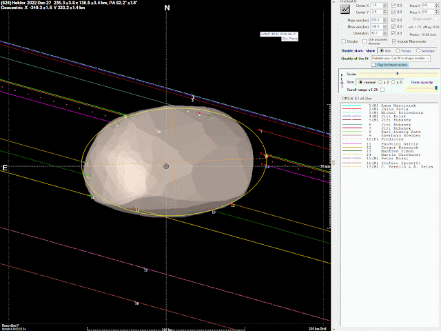 En la noche del 27 de este mes de diciembre 2022, la previsión nos decía que justo a las 21:59:33 Hektor pasaría por delante de la UCAC4 675-035793, obstruyendo su luz, ocultándola durante unos segundos, según la previsión exactamente durante 13,5s. Si el tiempo acompañaba era una ocasión excelente para poder grabar el evento.